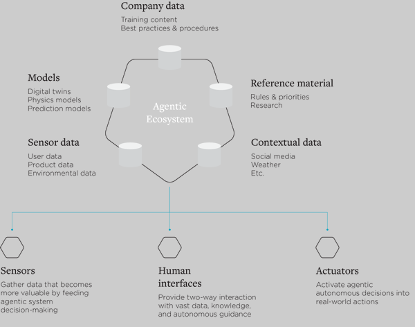 Sensors enable the perception layer of a system. Cameras, LiDAR, vibration sensors, and similar, are increasing in sophistication and decreasing in cost, and they allow us to capture real-time data from unstructured industrial environments and stream it to AI models. This data allows the system to have true environmental awareness.