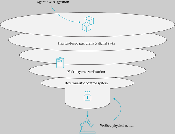 To ensure industrial grade safety, designing a multi-layered mitigation system is key. Individual approaches are specific to each deployment, but broadly the core of a safe system is ensuring the AI can’t command an action that is physically impossible or known to be unsafe. Before the AI’s proposed action is sent to the hardware, it’s first tested in a digital environment. If it violates a physical law or a predefined safety rule, like “never exceed a certain force”, the command is rejected immediately. Using a multi-layered verification approach means we’re not relying on the AI model alone. Additionally, passing commands through a series of deterministic checks, like sensor cross-validation and logic based sanity checks (e.g. is a person in the work cell?), provides additional layers of safety. From an architectural perspective, using a hybrid approach that utilizes the creative, probabilistic power of AI for high-level planning (“what is the most efficient way to stack these boxes?”), while delegating the execution of the movement to a deterministic, safety-focused control system that is firewalled from the AI allows for a system where the AI can suggest what to do, while the safety system has the final say on if it can be done safely.