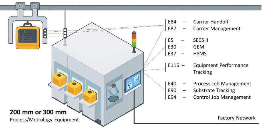 While not part of the GEM300 suite, E84 defines the parallel I/O handshake used between automated material-handling systems and equipment load ports. This handshake ensures that carriers are loaded and